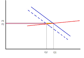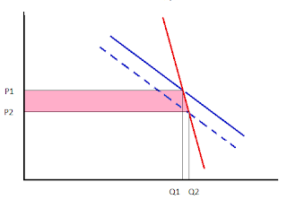 A linha azul tracejada é a nova curva da procura, inferior à anterior: assim, o preço baixa de P1 para P2 e a quantidade também baixa de Q1 para Q2. Mas, se o preço dos seus serviços baixa, as prostitutas ficam sem dúvida prejudicadas - no esquema acima, o retângulo rosa corresponde ao prejuízo que as prostitutas têm pela baixa do preço (a área do retângulo corresponde à quantidade de serviços que vendem - Q2 - multiplicada pela redução do preço - a diferença entre P1 e P2). Se estivessemos a falar de outro serviço ou produto qualquer, tanto o retângulo rosa como o triângulo amarelo (este correspondendo ao prejuízo derivado de passarem a ter menos clientes) contariam como perdas de quem vende, mas como aqui reduzir a prostituição é mesmo o objetivo, vamos aceitar as premissas dos defensores do modelo nórdico e considerar que as prostitutas só são prejudicadas por passarem a receber menos por cliente, mas não por passarem a ter menos clientes.